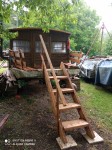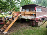Popis hausbótu: hausbót je loď (cca 8x2,5m) prozatím odstavená na našem horním pozemku u parkoviště než bude usazena na nové kotviště. Složená ze dvou místností. Místnost na zádi slouží jako ložnice a místnost na přídi jako obytná s kuchyňským pultem. Na přídi je venkovní posezení přes které se vchází do lodě. Hausbót je bez přípojky vody (sociální zařízení vzdálené cca 100m) V tomto hausbótu není povolen pobyt se psem. ).